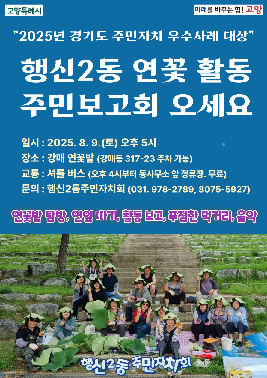 [주민보고회] 연꽃 활동, 주민잔치 엽니다~~ 애플수박 0 863 1 08.03 13:22 행신2동 주민자치회가 "2025년 경기도 주민자치 우수사례 대상"을 수상했습니다. 이에 대표 사업인 연꽃 활동을 주민들에게 보고하는 '연꽃 주민잔치'를 아래와 같이 엽니다. 많이 많이 오셔서 연꽃밭 탐방하시고, 연잎도 따시면서 즐거운 시간을 보내세요~~ 당일 오후 4시부터 행신2동 동사무소 앞 버스정류장에서 셔틀 무료버스가 운행됩니다. 연꽃밭 가시고 돌아오실 때 이용하실 수 있습니다. 1