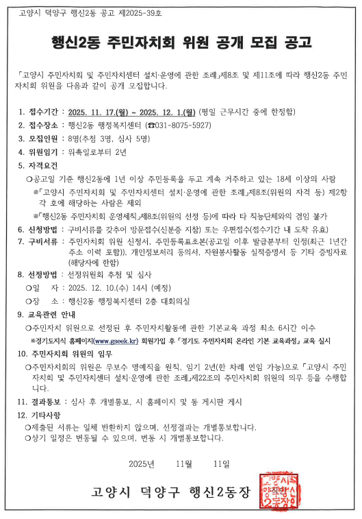 지원 자격은 '공고일 기준 행신2동에 1년 이상 주민등록을 두고 계속 거주하고 있는 18세 이상의 주민'이면