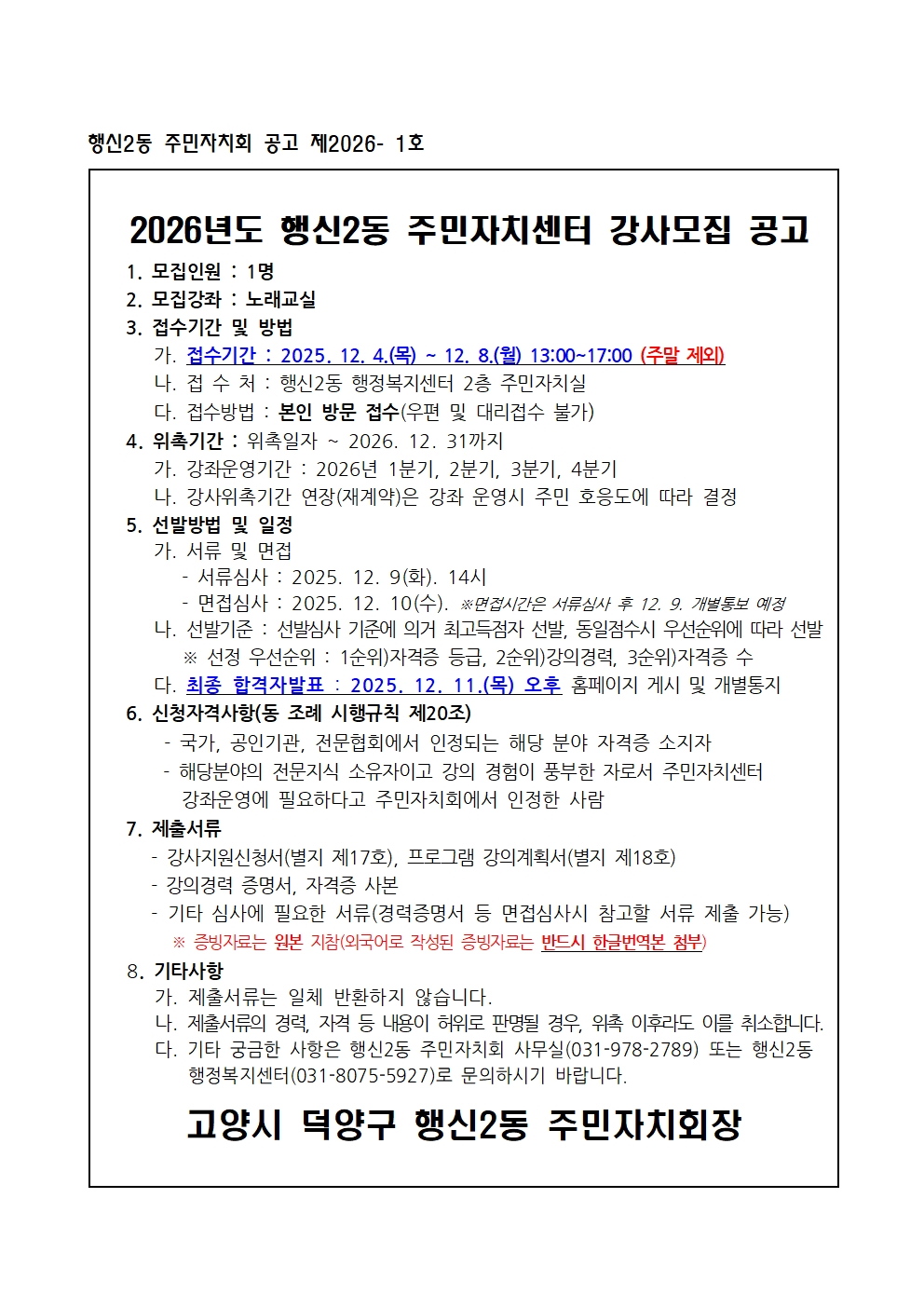 행신2동 주민자치회 노래교실 강사모집 행신2나루 0 181 0 12.05 08:12 다운로드시 20MP 차감 (최초 1회 / 재다운로드시 차감없음) 2025.12.05 08:12 2026년도 주민자치 프로그램 교육강사 선발 공고문.hwp (9.5K) + 0 행신2동 주민자치회 노래교실 강사모집행신2동 주민자치회에서는 문화강좌 프로그램을 운영 중인데, 새롭게 노래교실을 맡아 강의해 주실 강사를 모집합니다.오는 12월 8일까지 행신2동 행정복지센터 2층 주민자치실에서 접수합니다.자세한 내용은 아래의 공고문이나 첨부파일을 참조해 주시기 바랍니다. 0