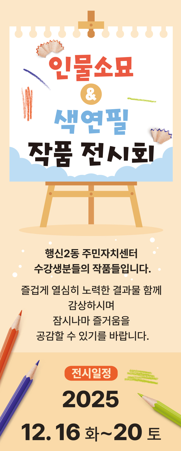 인물소묘-색연필 작품 전시회 개최 행신2나루 0 125 0 12.16 15:06 인물소묘-색연필 작품 전시회 개최 행신2동 주민자치센터는 12월 16일(화)부터 20일(토)까지 행신역 KTX 맞이방에서 인물소묘/색연필 작품 전시회를 개최한다.행신2동 주민자치센터에서 실시하는 문화강좌 수강생들의 작품을 선보이는 이번 전시회는 행신역을 이용하는 승객 및 일반 관람객들을 위해 마련된 자리로 행신역 2층 KTX맞이방에서 감상을 할 수 있다. 참고로 조만간 다양한 프로그램의 문화강좌 수강신청을 받을 예정이다. 0