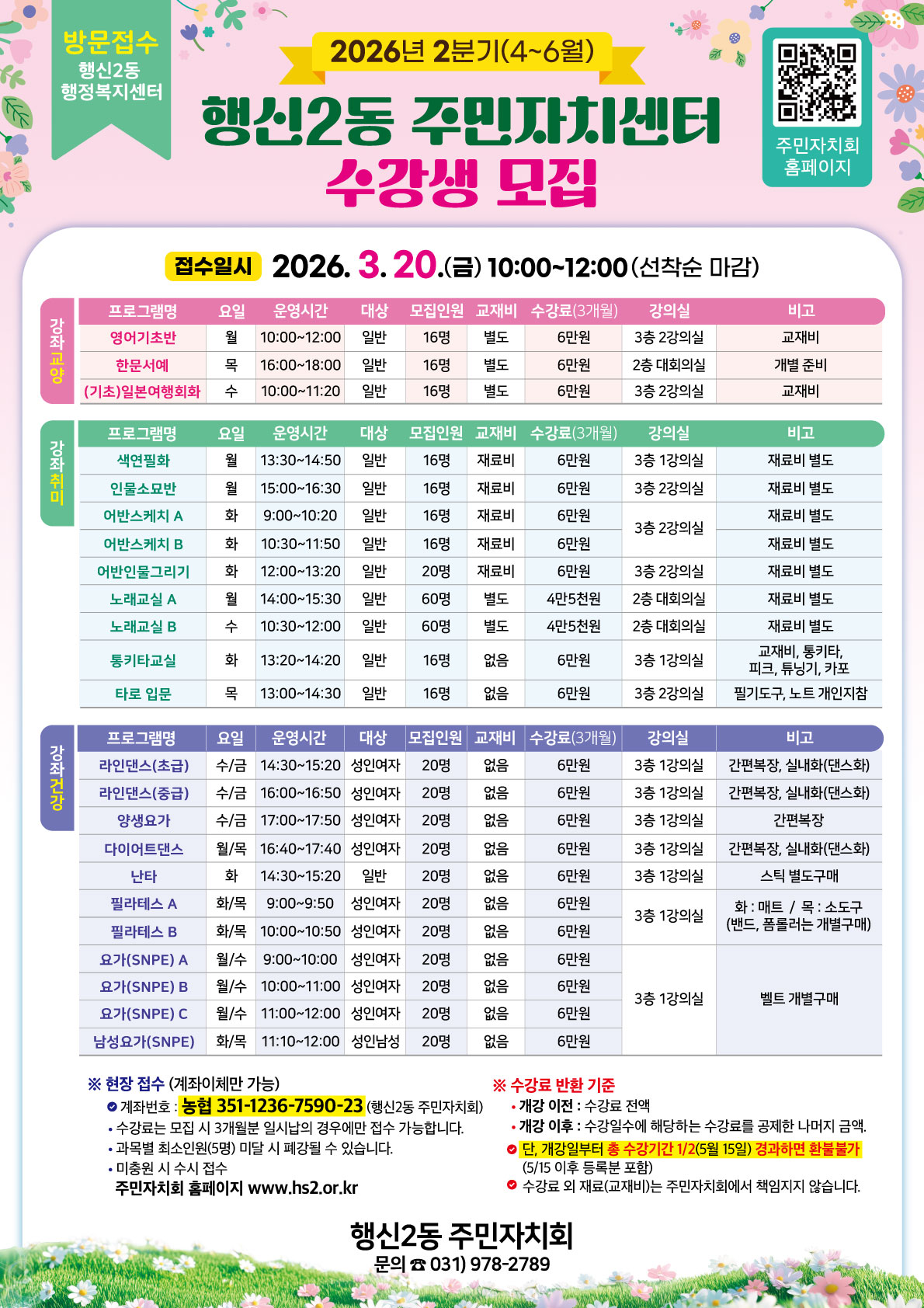 2026년 2분기 주민자치센터 프로그램 수강 안내 라파엘 0 3 0 4시간전 수강기간 : 26년 4월 1일 ~ 6월 30일 3개월접수날짜 : 26년 3월 20일 (금) 10시 ~ 12시접수장소 : 행신2동 행정복지센터 2층 대회의실접수방법 : 방문접수, 선착순 마감 0