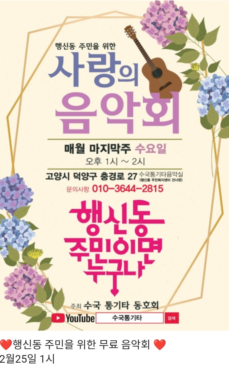 주민자치센터 문화강좌 통기타반에서 강의해 주시는 수국 선생님께서 오는 2월 25일 오후 1시에 수국통기타 동호회 주관으로 동네 주민들을 모시고 무료음악회를 엽니다.